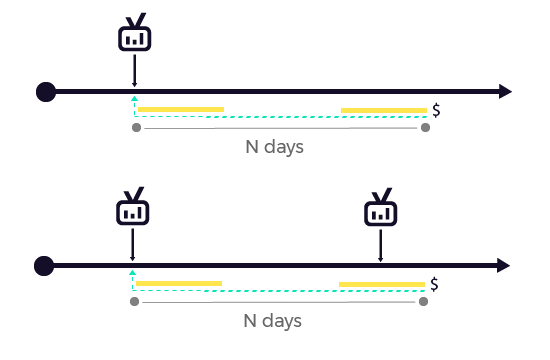 Timeline of active and inactive sessions: A user might come to the advertiser’s website or app after the ad aired and immediately convert during the active session. But, what if they wait several hours, days, or even months? This can be further complicated if more ads are aired during these inactive sessions. In that case, how to tell which session drove the conversion event?
