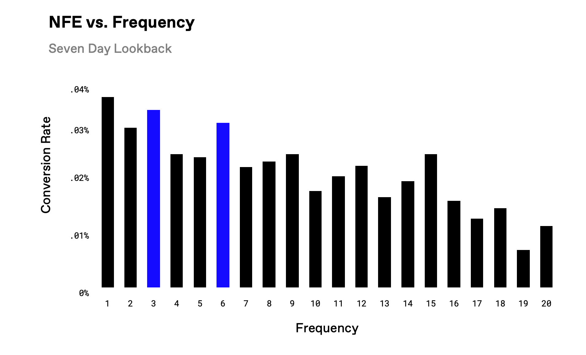 This discovery led us to our next question: does it make sense to implement a secondary daily frequency cap? More specifically, what happens if all 3 or 6 impressions occur in one day? To answer this question, we analyzed one-day NFE data.
